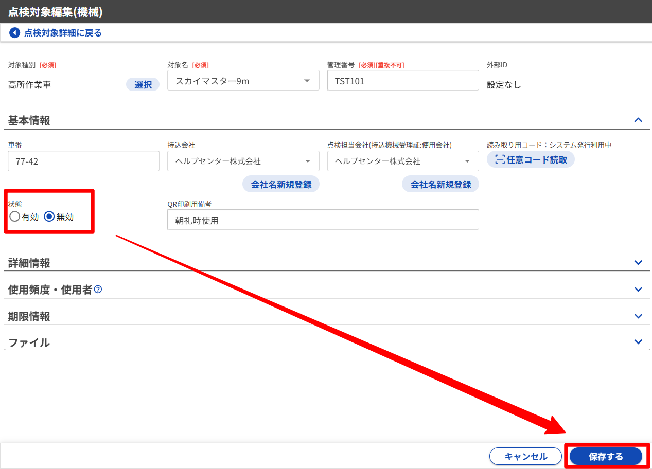 A.機械や設備など、一度登録した点検対象は「削除」ができません。「無効」にすることで一覧から非表示にして、点検の生成や予定管理への表示を止めます。機械の返却やテスト登録した点検対象は無効にしてください。