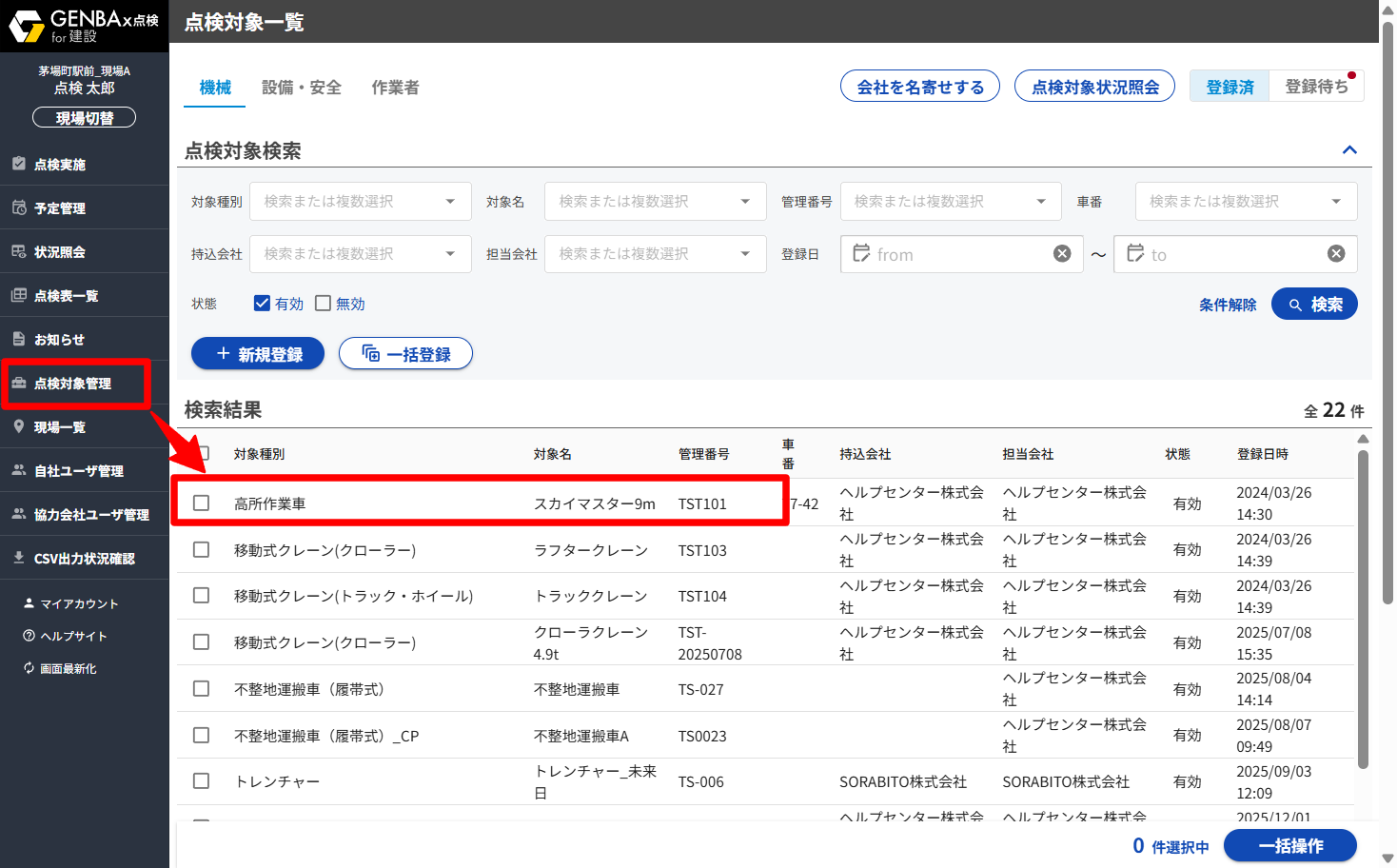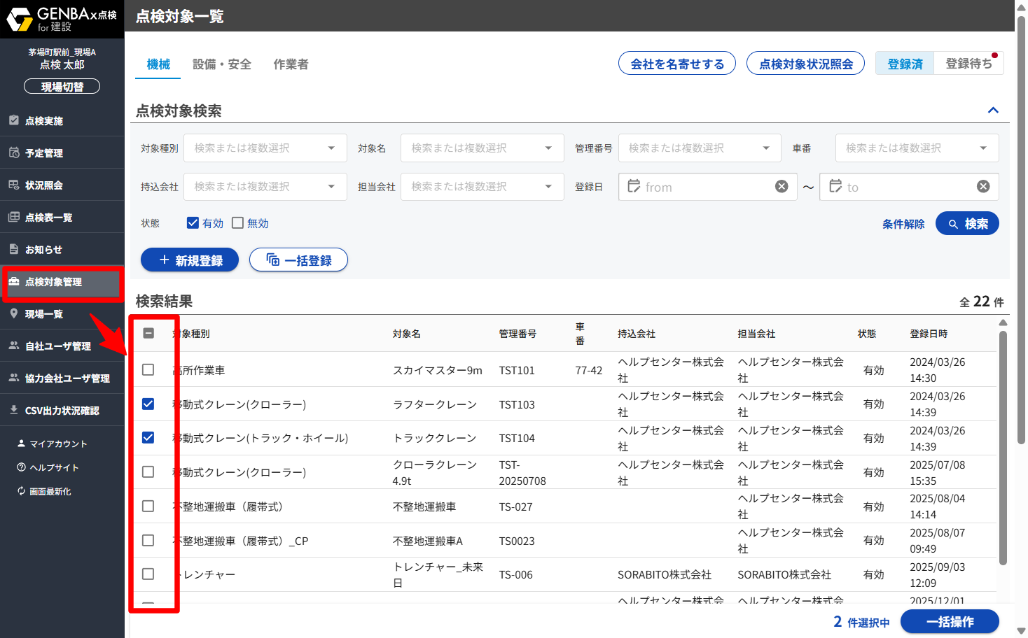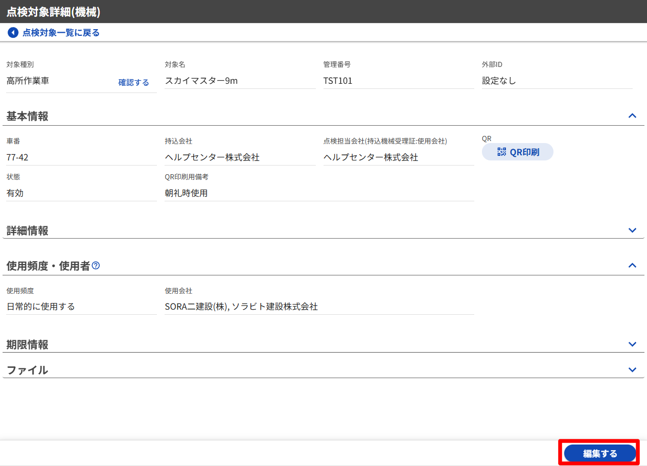 点検対象編集機能の詳細は「機械、足場、作業者情報を編集する(点検対象編集)」をご確認ください。