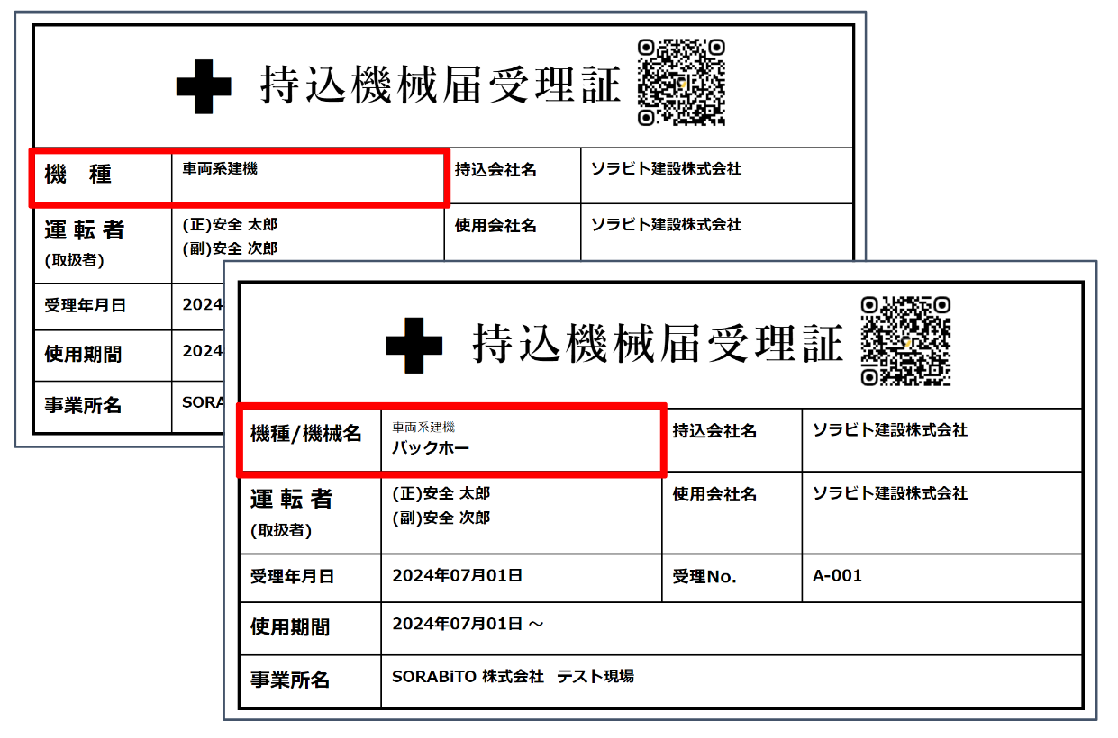 これまで持込機械届受理証は機種名のみが表示されていましたが、機械名も表示するように改善しました。