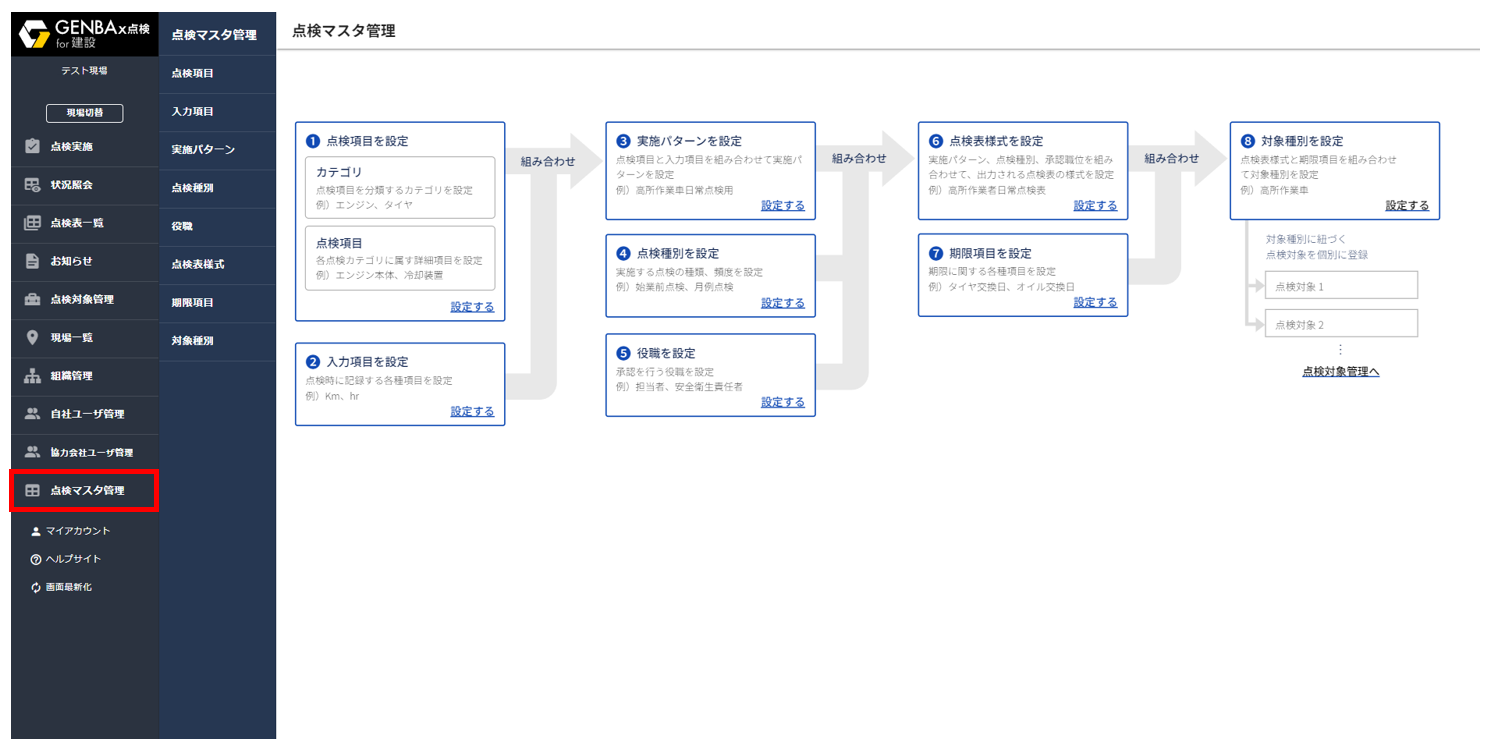 自社ユーザの画面にて、点検マスタ管理のメニューがご利用いただけるようになりました。