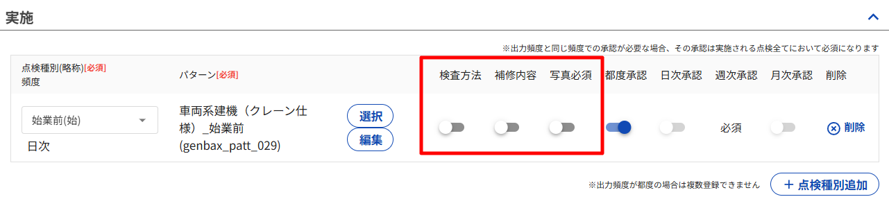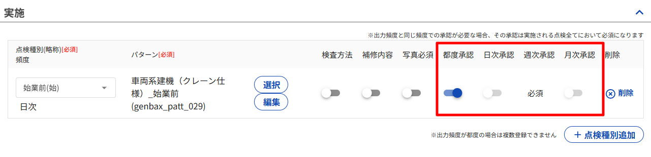 また、承認頻度が2種類以上あるときは、点検種別ごとに承認頻度のON/OFFを変更することができます。