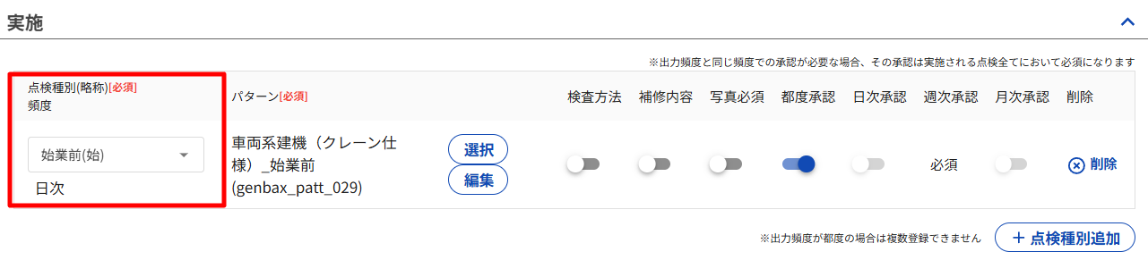 実施に表示されている頻度は自動で点検が作成される頻度です。プルダウンから点検種別を選ぶと、頻度(その他/日次/週次/月次)が自動で表示されます。