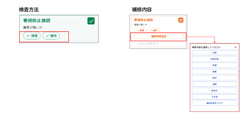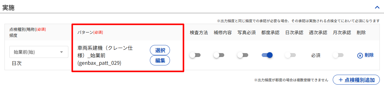 実施欄のパターン、検査方法、補修内容は、変更がない場合編集不要です。(参考:点検項目を削除したい)