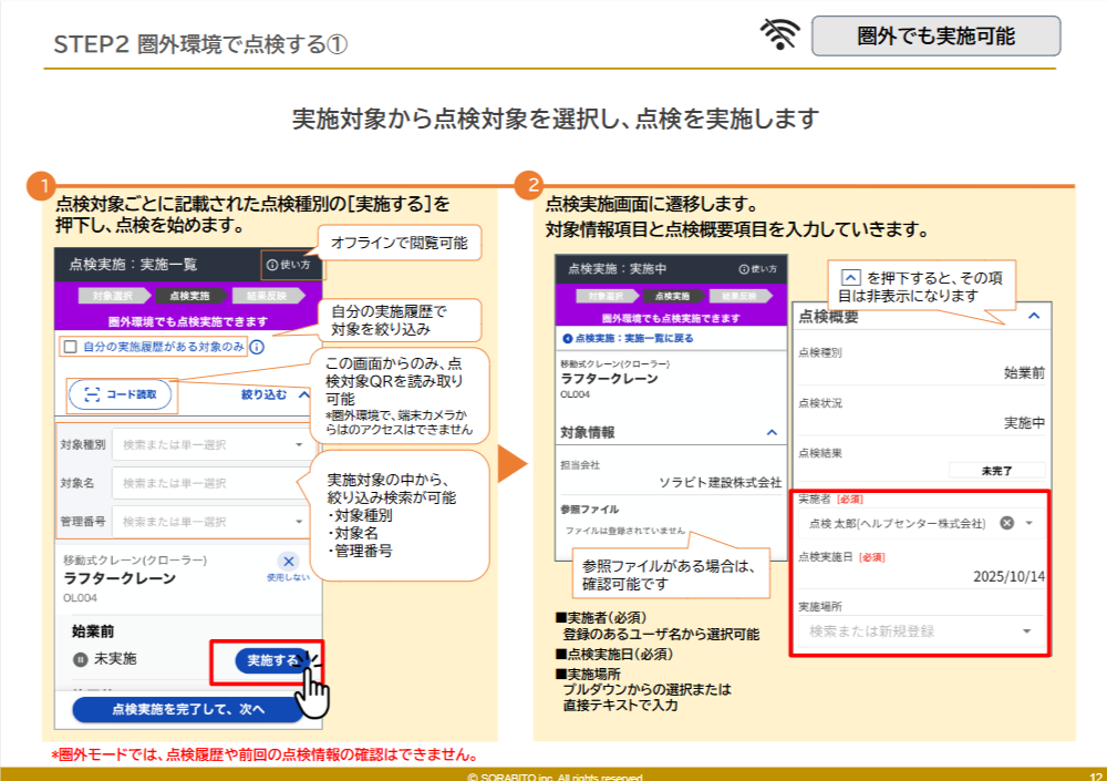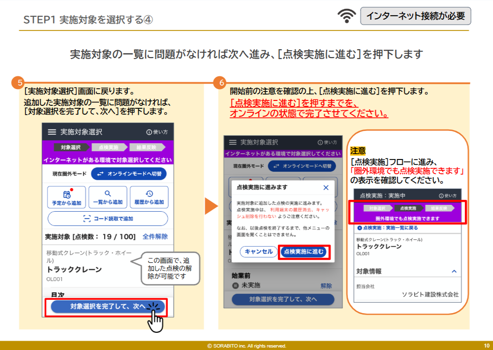 点検フローが「点検実施」に進み「圏外環境でも点検実施できます」の表示になるまで、インターネット接続が可能な環境で行ってください。