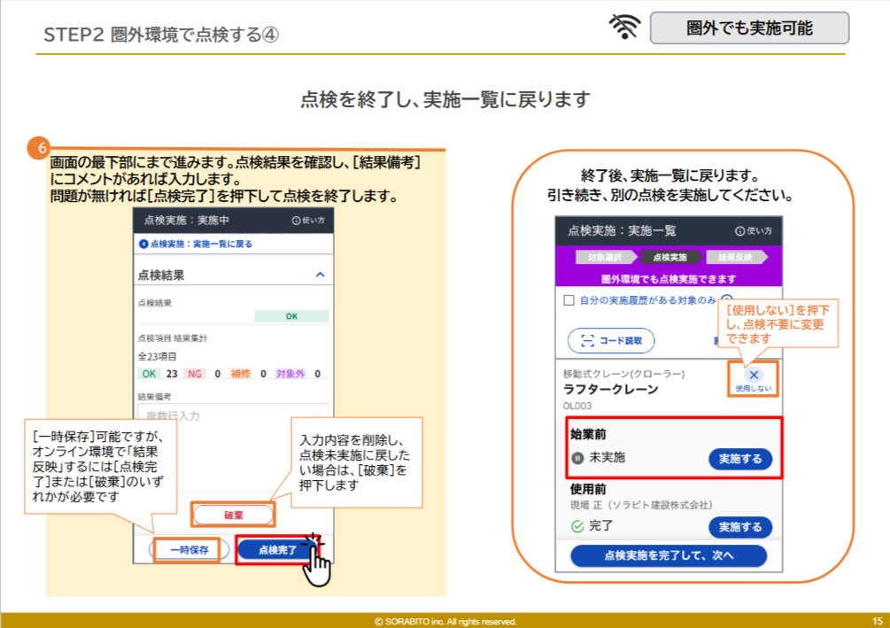 点検の一時保存は可能ですが、オンライン環境で「結果反映」を行うには、[点検完了]または[破棄]を行う必要があります。