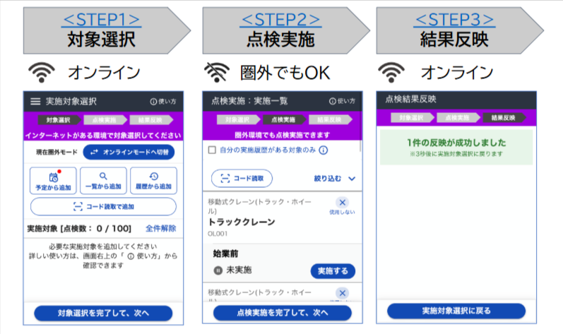 オフライン点検は3つのステップで点検を行います。STEP2「点検実施」以外はオンラインでの操作が必要です。