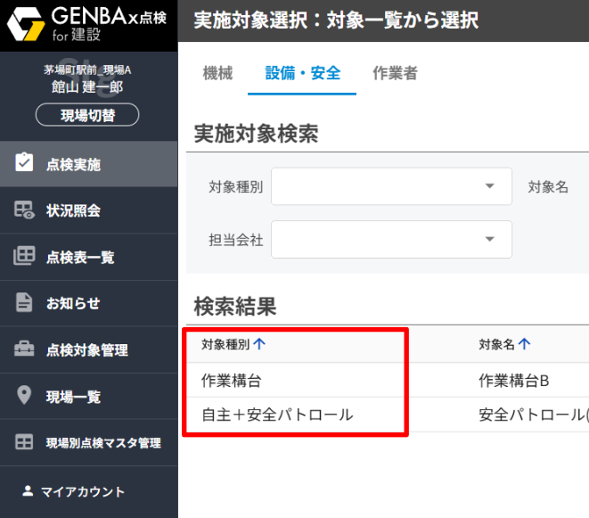 機械に設定されている対象種別は、[点検実施]の一覧などで確認することが出来ます。