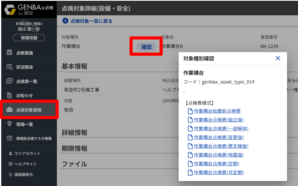 対象種別に紐づいている点検の種類を確認することが出来ます。