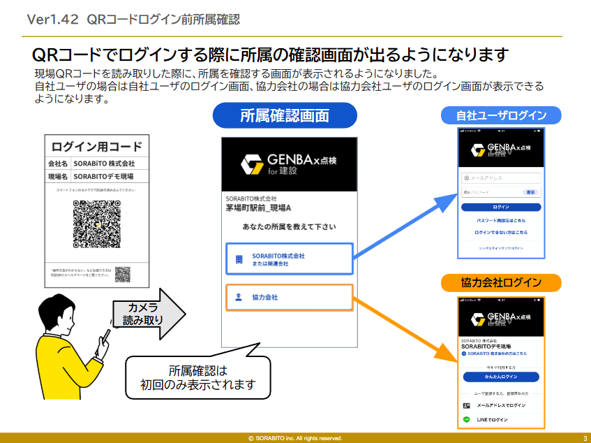 ①QRでログインする際に所属の確認画面が出るようになります