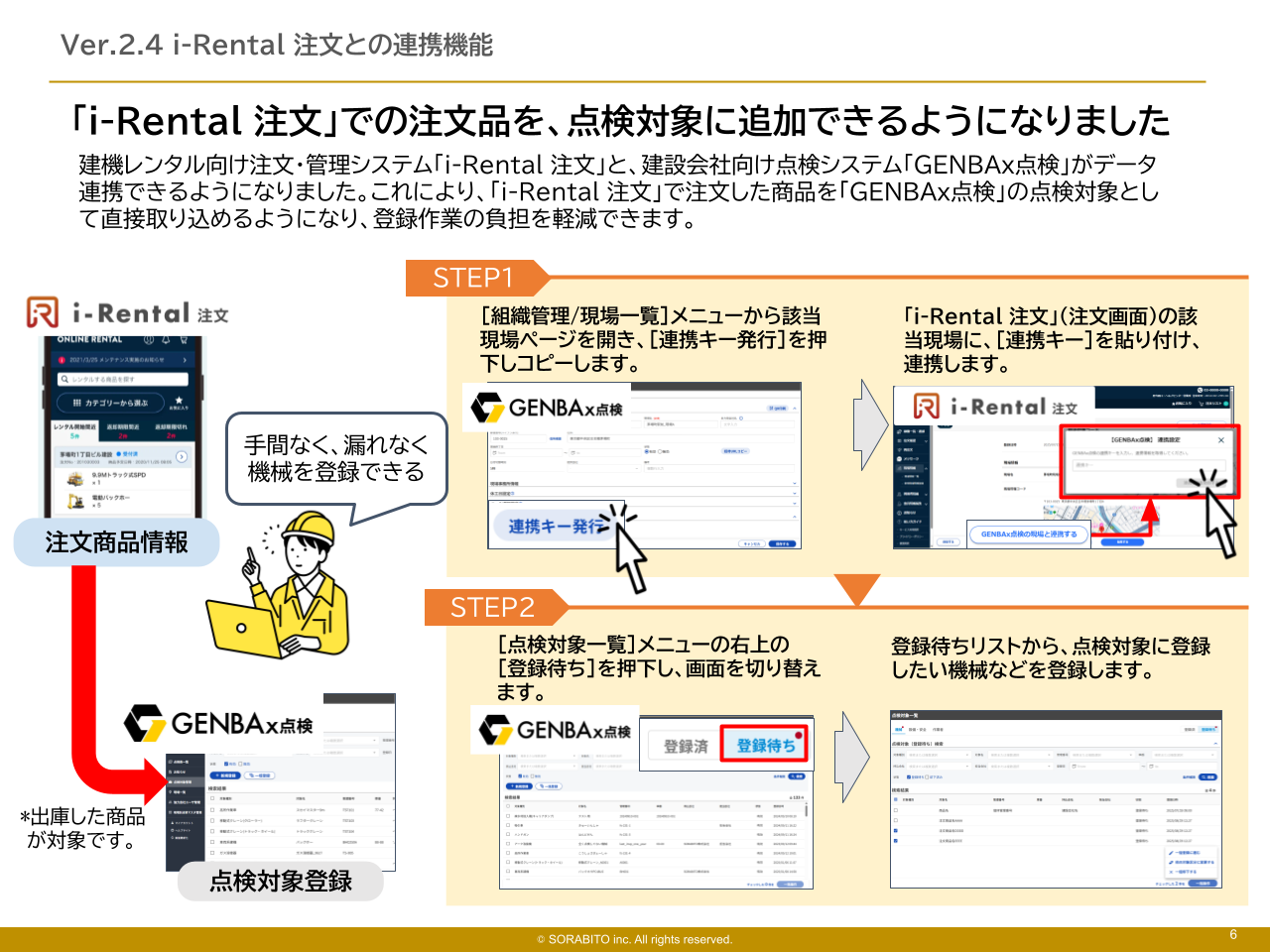 *一部の「i-Rental 注文」は、GENBAx点検との連携機能のご提供がない場合がございます。ご利用を希望される場合は、ご利用のレンタル会社またはSORABITOまでお問い合わせください。