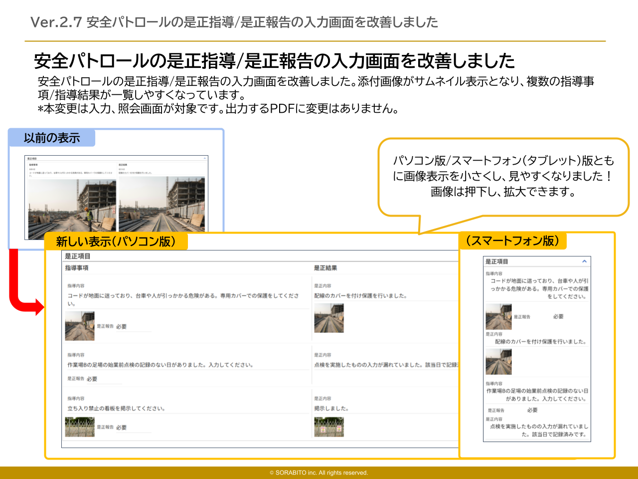 操作画面:[点検実施]>(設備・安全)安全パトロール安全パトロールの是正指導/是正報告の入力画面を改善しました。添付画像がサムネイル表示となり、複数の指導事項/指導結果が一覧しやすくなりました。