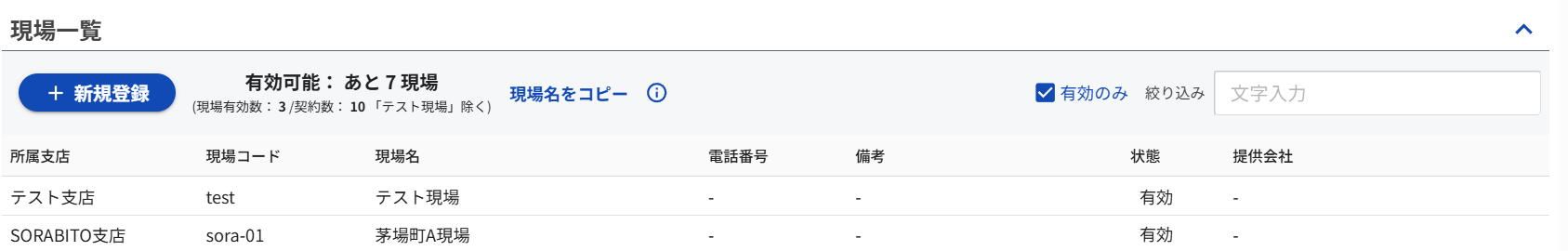 現場一覧は、システム管理者、支店管理者が編集可能です。