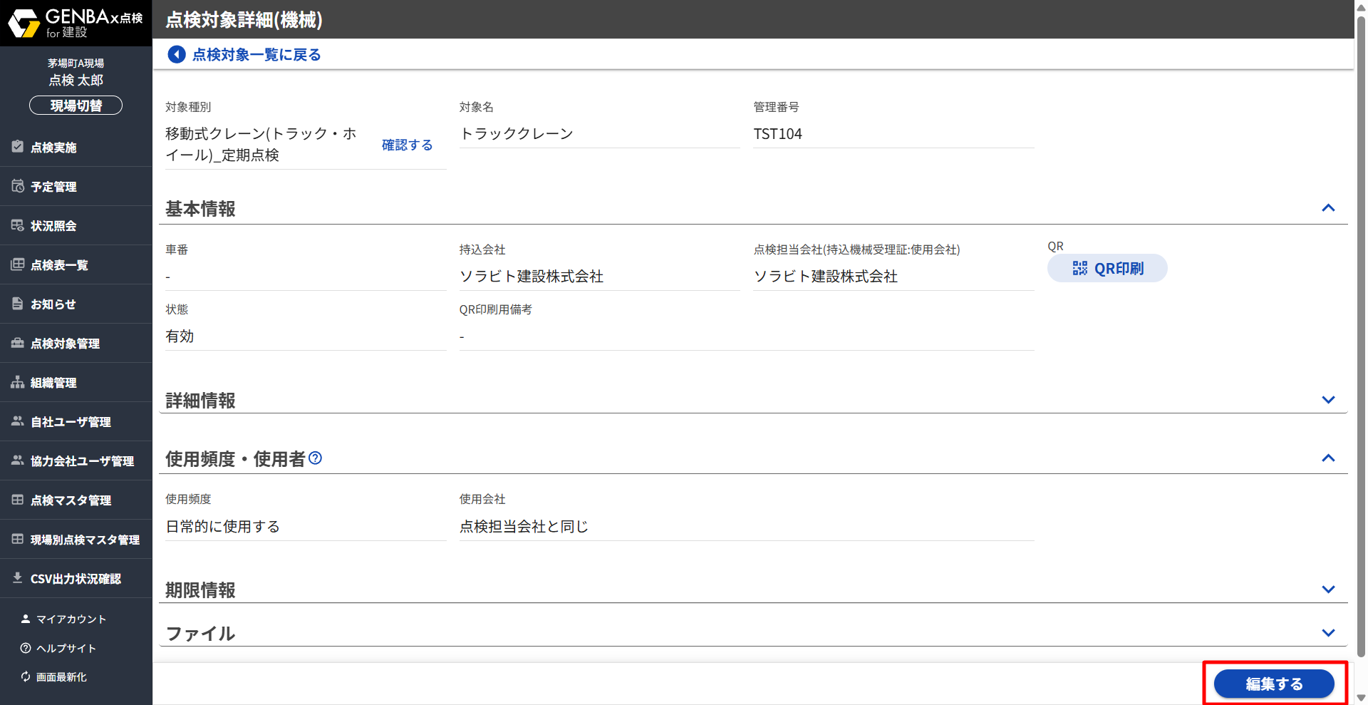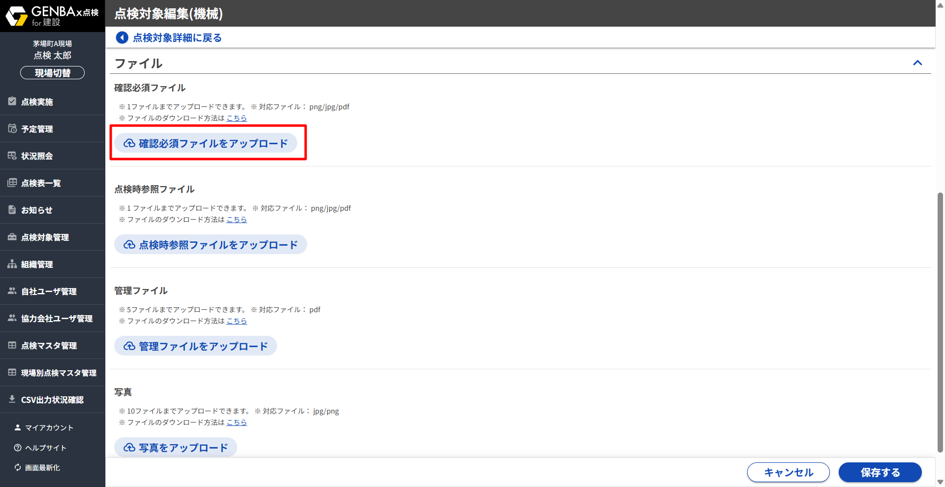 点検対象管理にて、点検対象に確認必須ファイルを設定できます。