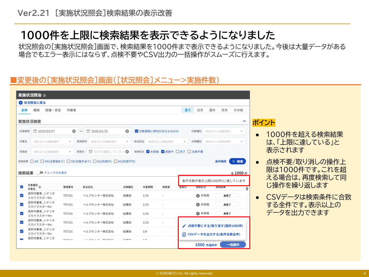 操作画面:[状況照会]>[実施状況照会]状況照会の[実施状況照会]画面で、検索結果を1000件まで表示できるようになりました。今後は大量データがある場合でもエラー表示にはならず、点検不要やCSV出力の一括操作がスムーズに行えます。