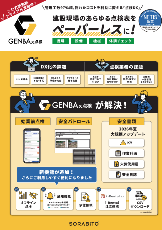 現在「GENBAx点検」をご利用、ご検討中の皆様が、別現場への紹介や、社内での活用拡大に向けた説明資料としてご使用いただけるPDFデータを公開しています。
