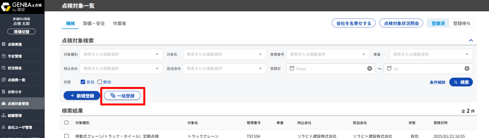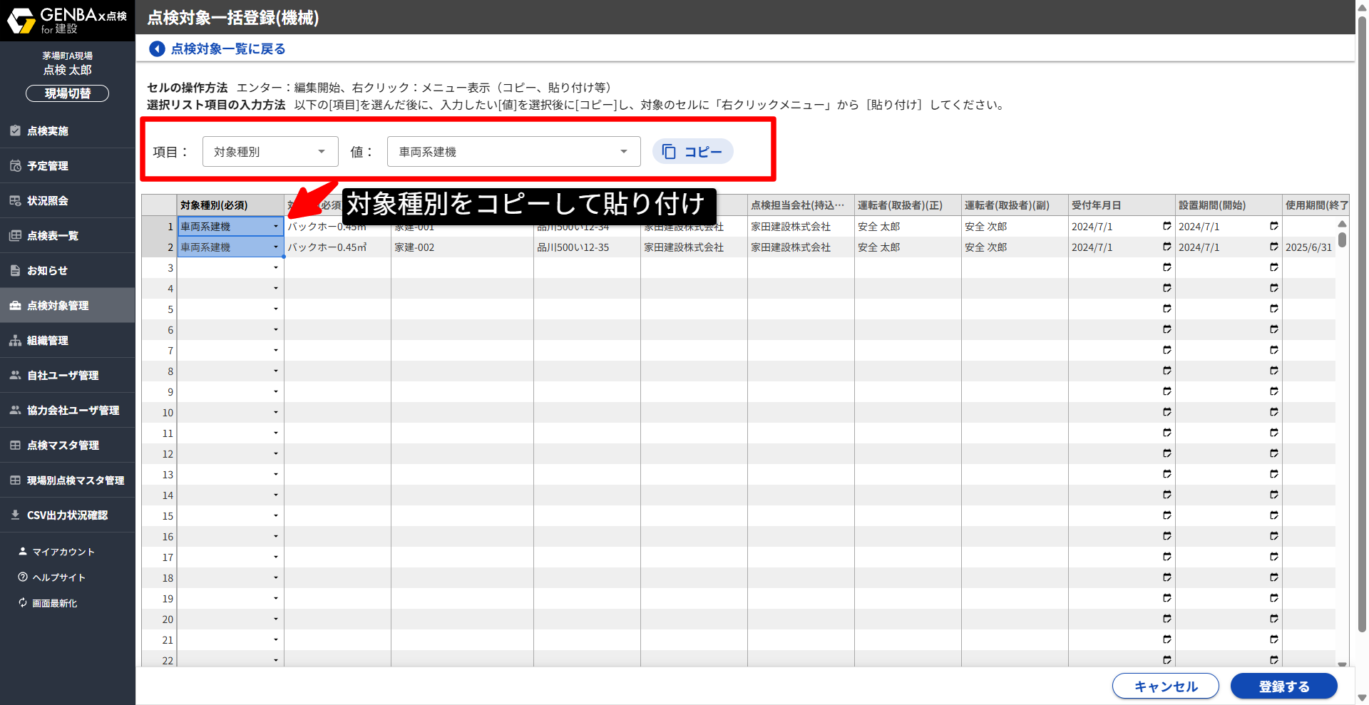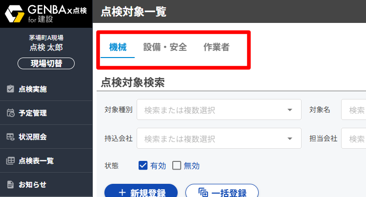 ②[点検対象管理]から[一括登録]を開く