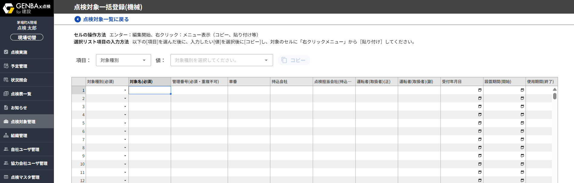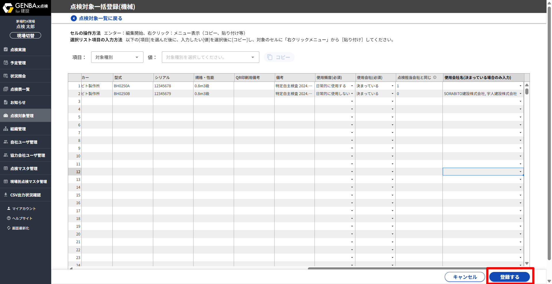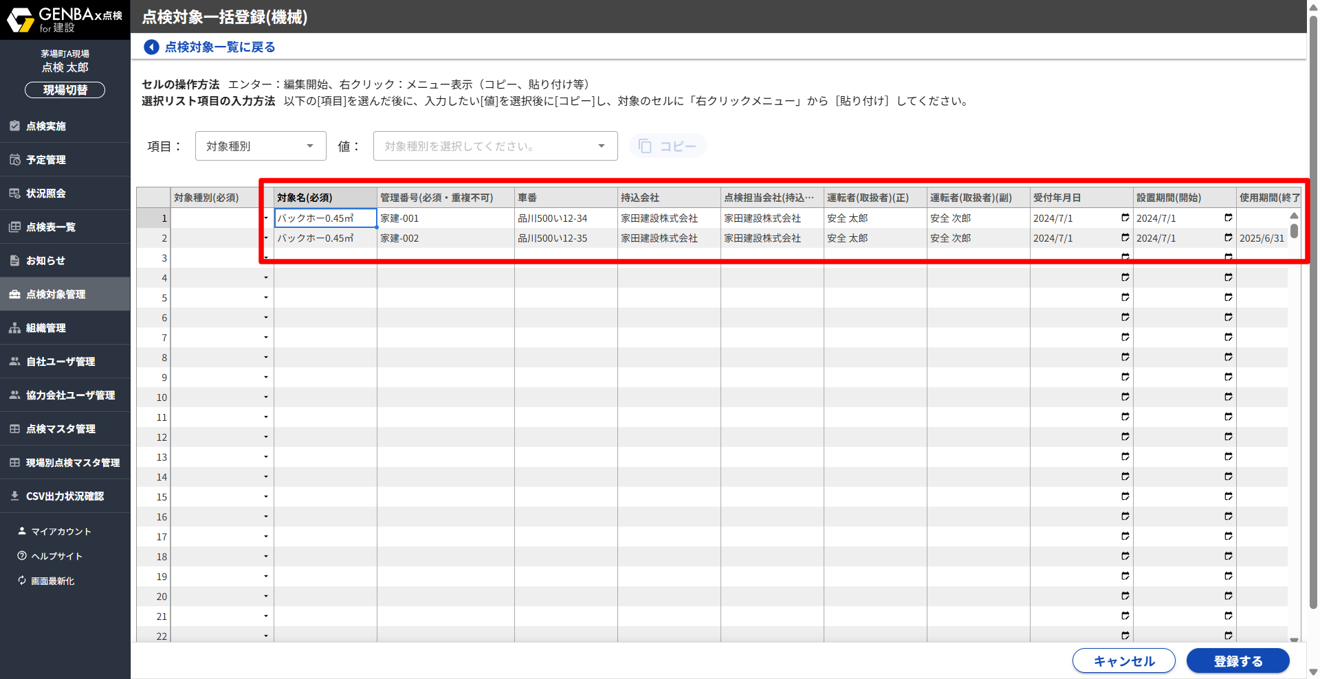 点検対象一括登録画面が表示されます。