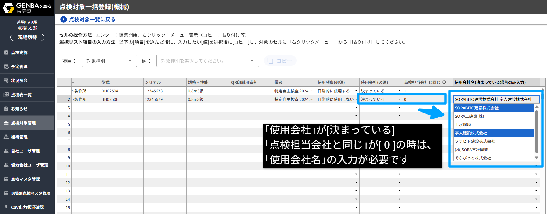 - かつ「点検担当会社と同じ」に[0]が入っている場合