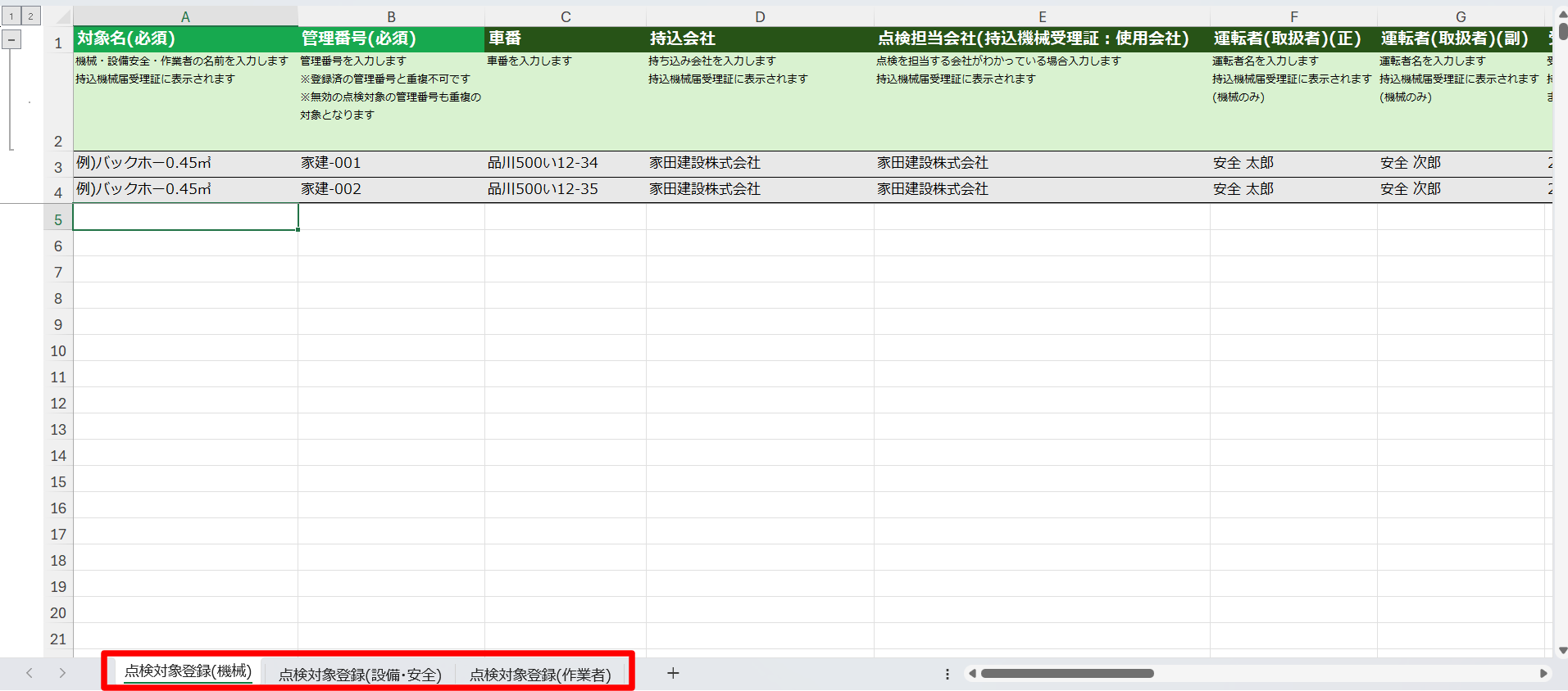 シートは「点検対象登録(機械)」、「点検対象登録(設備・安全)」、「点検対象登録(作業者)」の3シートがあります。