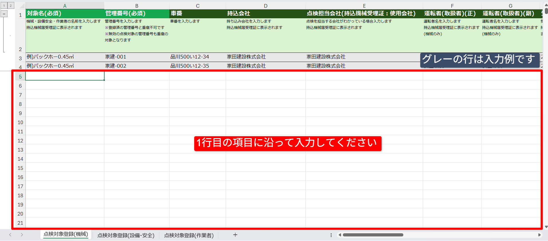 その下の白い行から、項目名に合わせて情報を入力してください。