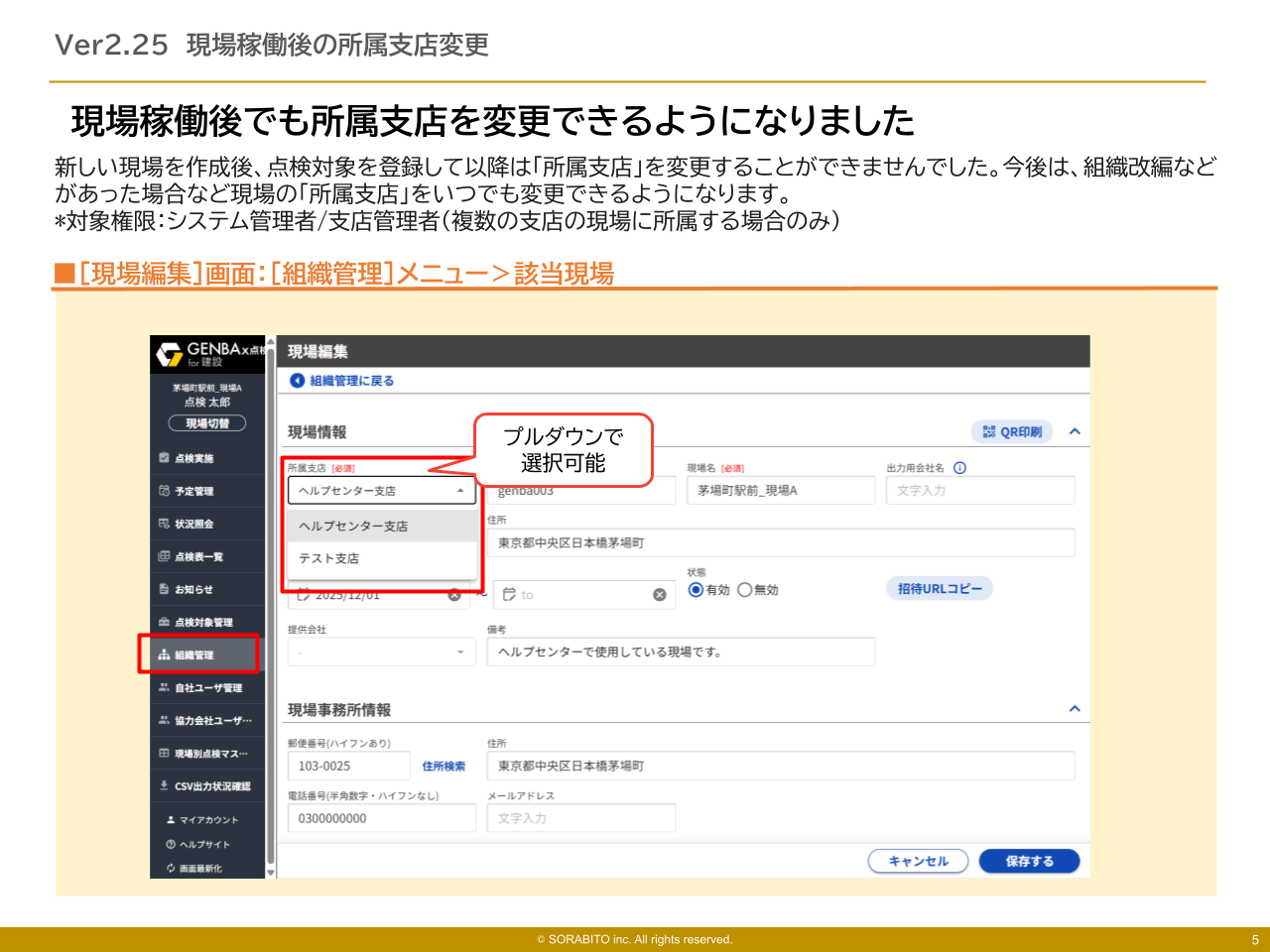 設定画面:[組織管理]>[該当現場]新しい現場を作成後、点検対象を登録して以降は「所属支店」を変更することができませんでした。今後は、組織改編などがあった場合など現場の「所属支店」をいつでも変更できるようになります。