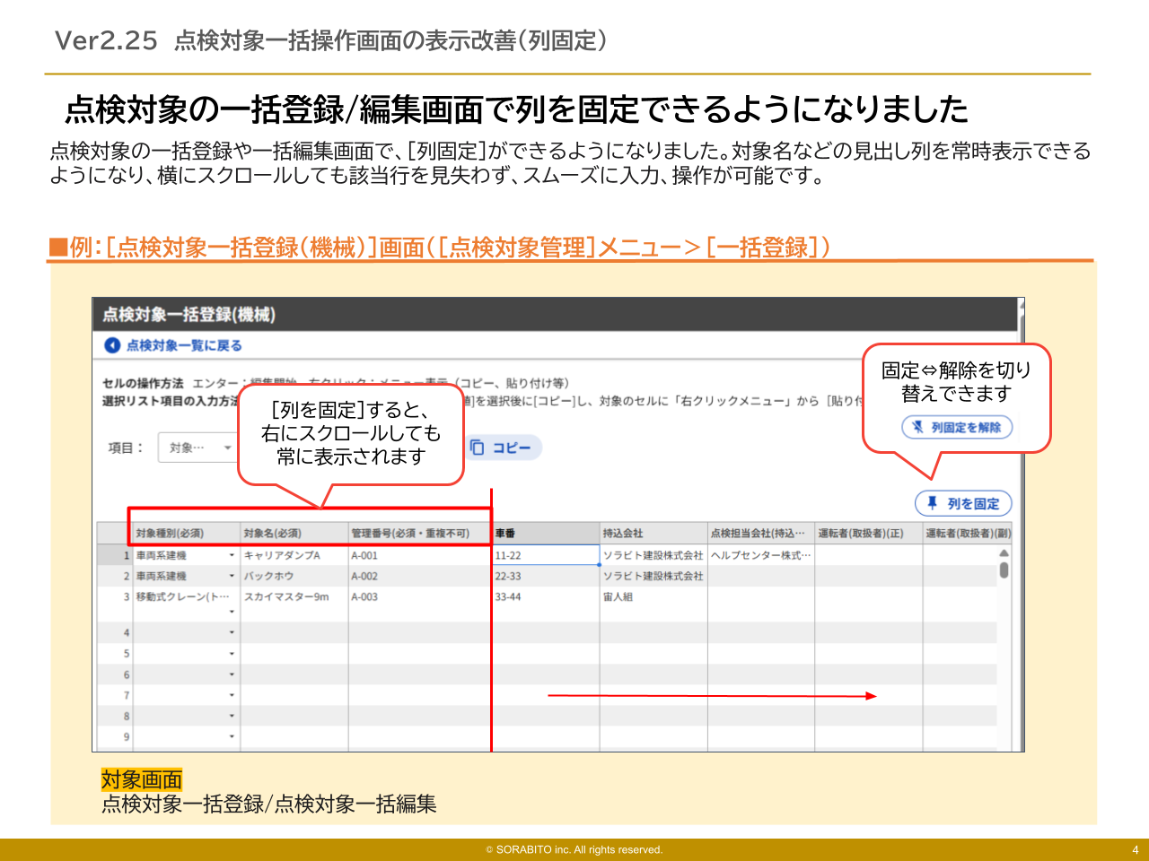 ②点検対象の一括登録/編集画面で列を固定できるようになりました