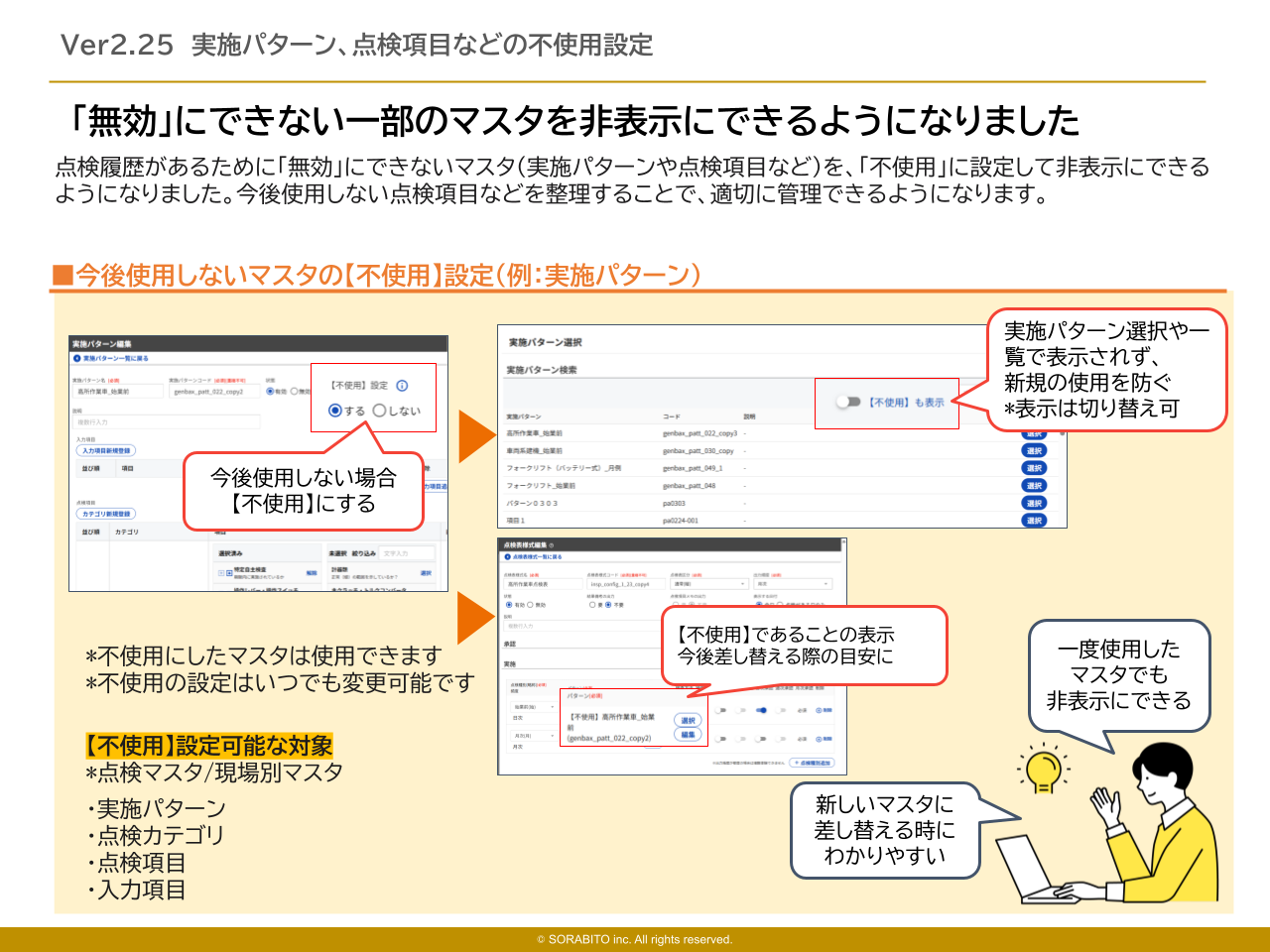 設定画面:[点検マスタ管理]/[現場別マスタ管理] > [点検カテゴリ]/[点検項目]/[入力項目]/[実施パターン]点検履歴があるために「無効」にできないマスタ(実施パターンや点検項目など)を、「不使用」に設定して非表示にできるようになりました。今後使用しない点検項目などを整理することで、適切に管理できるようになります。