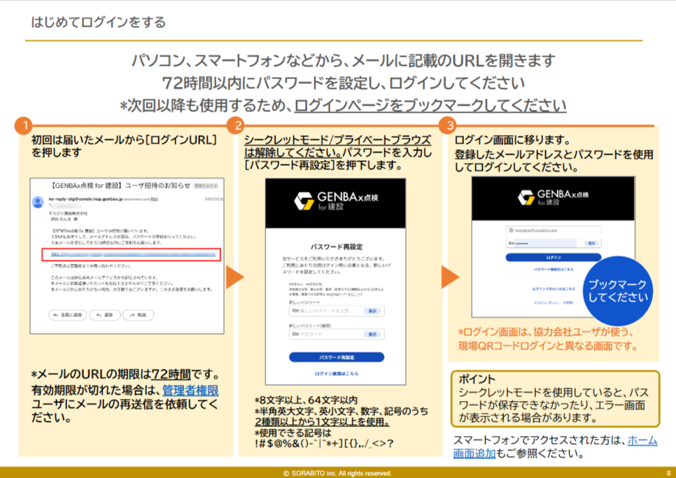 ・メール記載のURL有効期限は72時間です。期限が切れた場合は管理者の方に再送信を依頼してください。