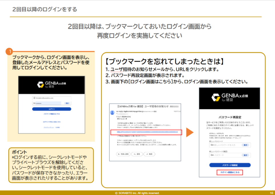GENBAx点検は導入企業ごとに環境(URL)が異なります。URLがわからず、招待メールも見つからない場合は、同じ環境でログインできている方からURLの転送を依頼してください。(カメラが壊れて、現場のQRからログインできません(現場ログインURLの取得))
