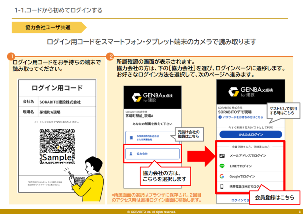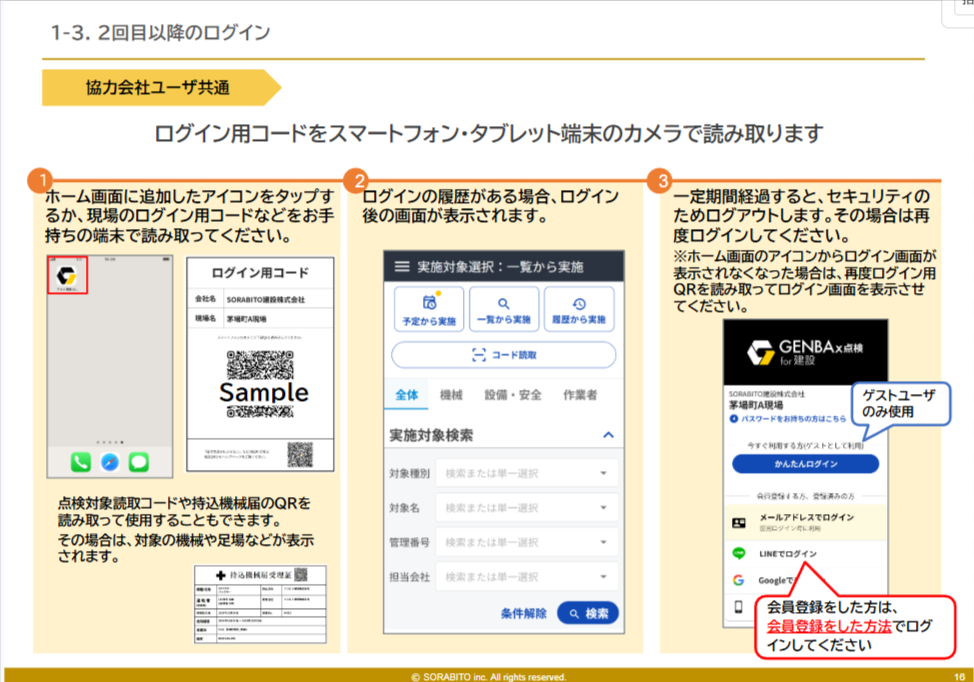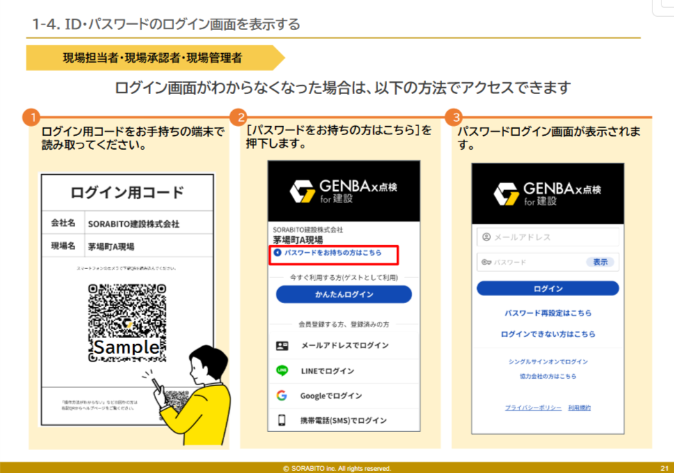 ここでは、GENBAx点検へログインする方法を説明します。導入企業(元請け/自社)と協力会社で方法が異なります。