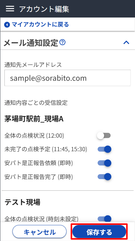 ・通知内容ごとの受信設定(ON/OFFを切り替え) *通知時刻は現場別に設定します(通知機能を使うをご確認ください)