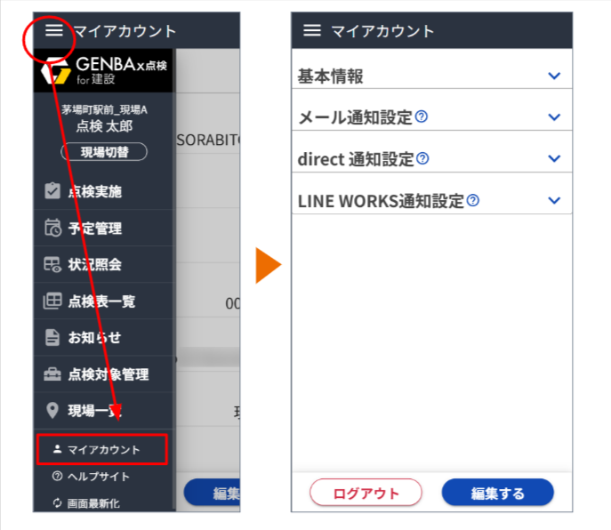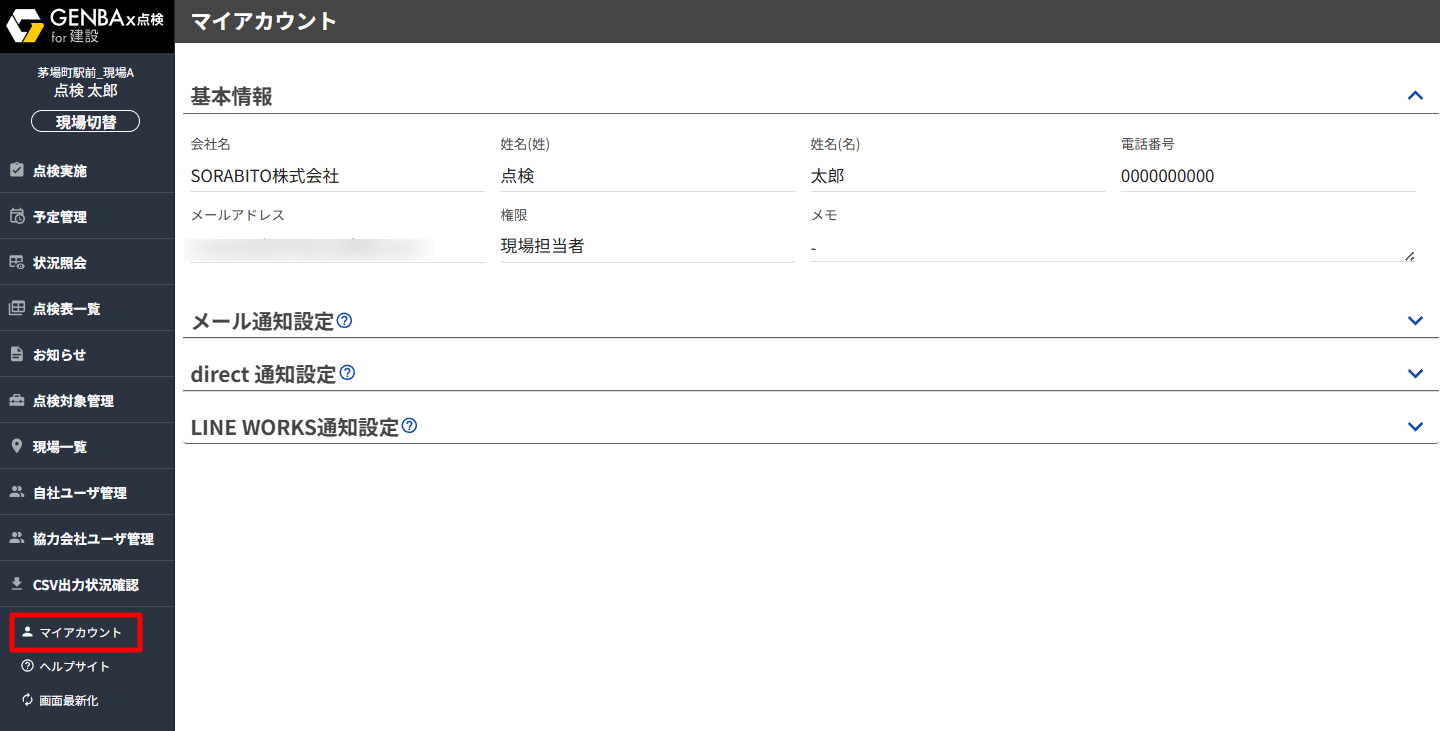 自社/協力会社を含むすべてのユーザへ、ご自身の登録状況を表示するメニューです。一部を除き情報の編集も可能です。パソコンでも、スマートフォン/タブレットでも、メニュー下部の[マイアカウント]を開くと確認することができます。