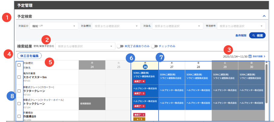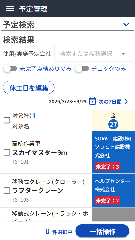 ①で準備すると、点検予定や使用会社の情報が連携されます。毎日の会議などで予定を確認しながら、変更を入力していくことができます。
