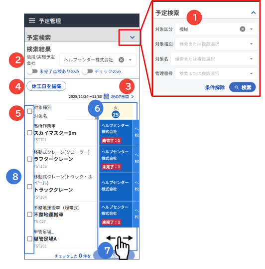 ①予定検索:点検対象の区分や、管理番号などで検索できます