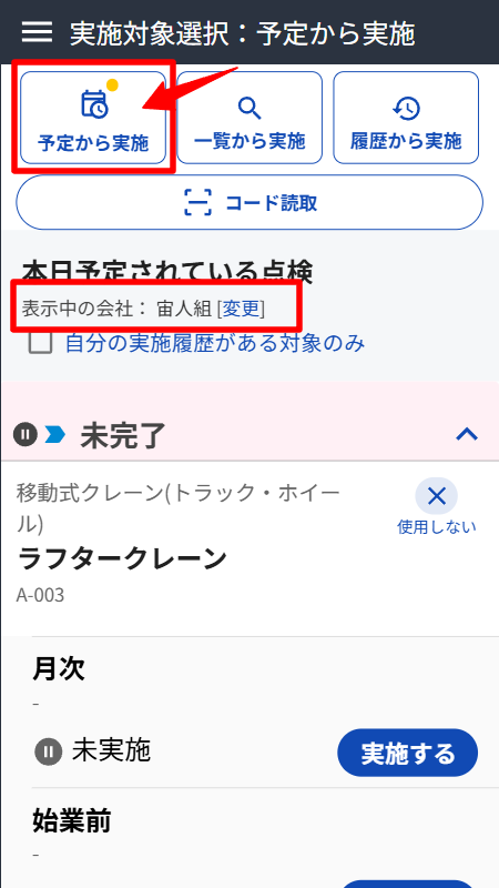 使用会社の予定が適切に組まれた現場では、「予定から点検を実施」することができます。自社の点検予定リストから点検を実施でき未完了も一目で確認可能です。