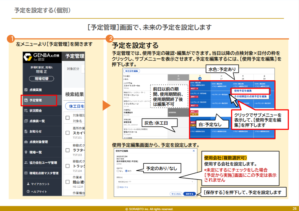 予定管理機能は、「どの会社がどの点検を行うのか」を事前に設定することで、点検をスムーズに行っていただくものです。
