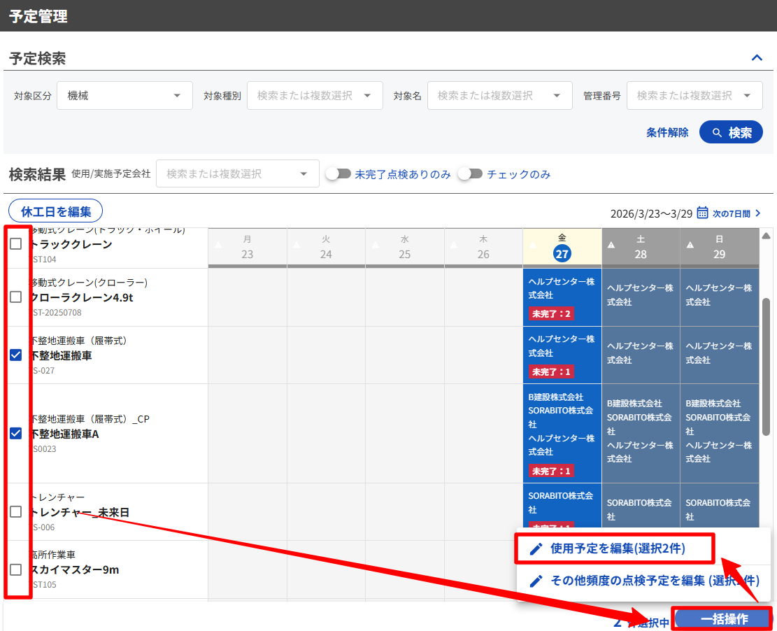 ・[予定管理]画面で、変更したい点検対象をチェックし、[一括操作]を押下します。