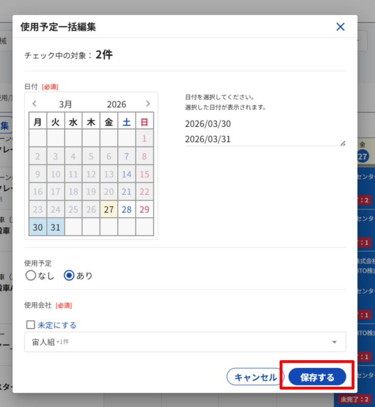 日付(複数選択可)。使用予定(なし/あり)、使用会社(複数選択可/未定の場合チェック)の入力をして、[保存する]を押下します。